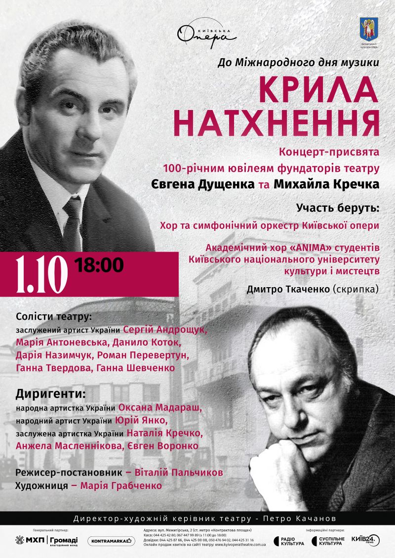У Міжнародний день музики, який відзначається 1 жовтня, Київська опера запрошує на концерт «Крила натхнення», присвячений 100-річним ювілеям двох фундаторів цього театру – Євгена Дущенка та Михайла Кречка.