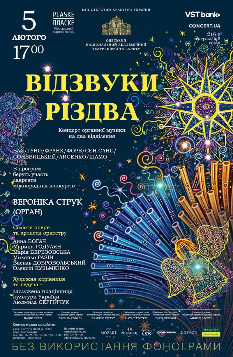 Особлива атмосфера зимової фієсти, майстерність виконавців — української органістки Вероніки Струк та провідних солістів опери і артистів оркестру стануть справжньою розрадою та джерелом натхнення для наших глядачів, які проведуть цей вечір в захоплюючій атмосфері величної і прекрасної органної музики.