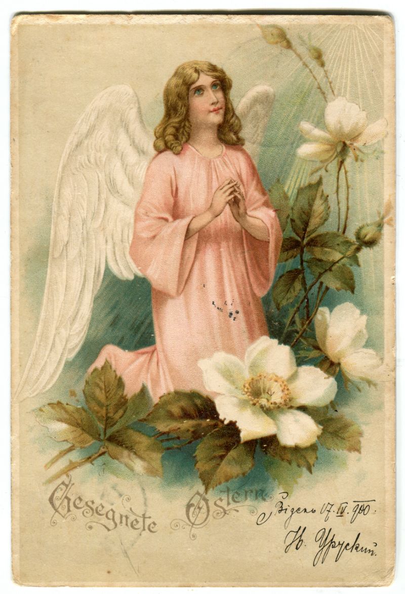 Тексти великодніх привітань свідчить, що для рідних та приятелів Модеста Менцинського, це свято було ідеальним для підтримання контактів зі співаком та вияву щирих почувань. Збережені штампи допомагають датувати ці послання. Так, найдавнішу картку написано 1900 року (№ 670 фММ) й адресовано Модесту Менцинському у Франкфурт-на-Майні. Це місто відіграло особливу роль у його творчій біографії: тут він студіював вокал у професора Юліуса Штокгаузена, а 18 вересня 1901 року відбувся його успішний дебют у головній партії Ліонеля в опері Фрідріха Флотова «Марта». Ця поштівка є прекрасним зразком європейської філокартії початку ХХ століття. Друкований німецькою мовою напис «Gesegnete Ostern» («Благословенного Великодня») вказує на те, що вона була виготовлена в Німеччині або Австро-Угорщині — тогочасних лідерах європейської поліграфії. Популярний метод хромолітографії дозволяв досягати м’яких переходів кольорів, що підкреслювало святковий сюжет: ангел в рожевому вбранні, який молиться серед квітів під променями божественного світла. Рукописний текст вказує на час і місце відправлення цього послання – Відень, 17.ІУ.900. Ця дата – вівторок після Великодня за григоріанським календарем 1900 року, підтверджує використання листівки саме як святкового привітання. Підпис відправника також можна відчитати, це – Ів. Уруський. Для біографів Менцинського це може служити підказкою щодо визначення його особи. В той час у Відні проживало багато українців. Так, зокрема, у списках студентського товариства «Січ» та парафіян церкви Св. Варвари числилися особи з таким прізвищем. Звертання «Високоповажний Пане» підкреслює глибоку взаємну повагу кореспондентів. Ця листівка - не просто вітання зі святом. Це цінний артефакт для визначення історичної топографії життя співака, на що вказує точна адреса - Frankfurt am Main, Königstrasse 1, a part / Bockenheim. І ще одна цікава технічна деталь: листівка дійшла за один день (відправлення з Відня – 17.ІУ.1900, отримання у Франкфурті – наступного дня 18 квітня). Сьогодні можемо лише подивляти фантастичну швидкість пошти Австро-Угорщини та Німеччини.